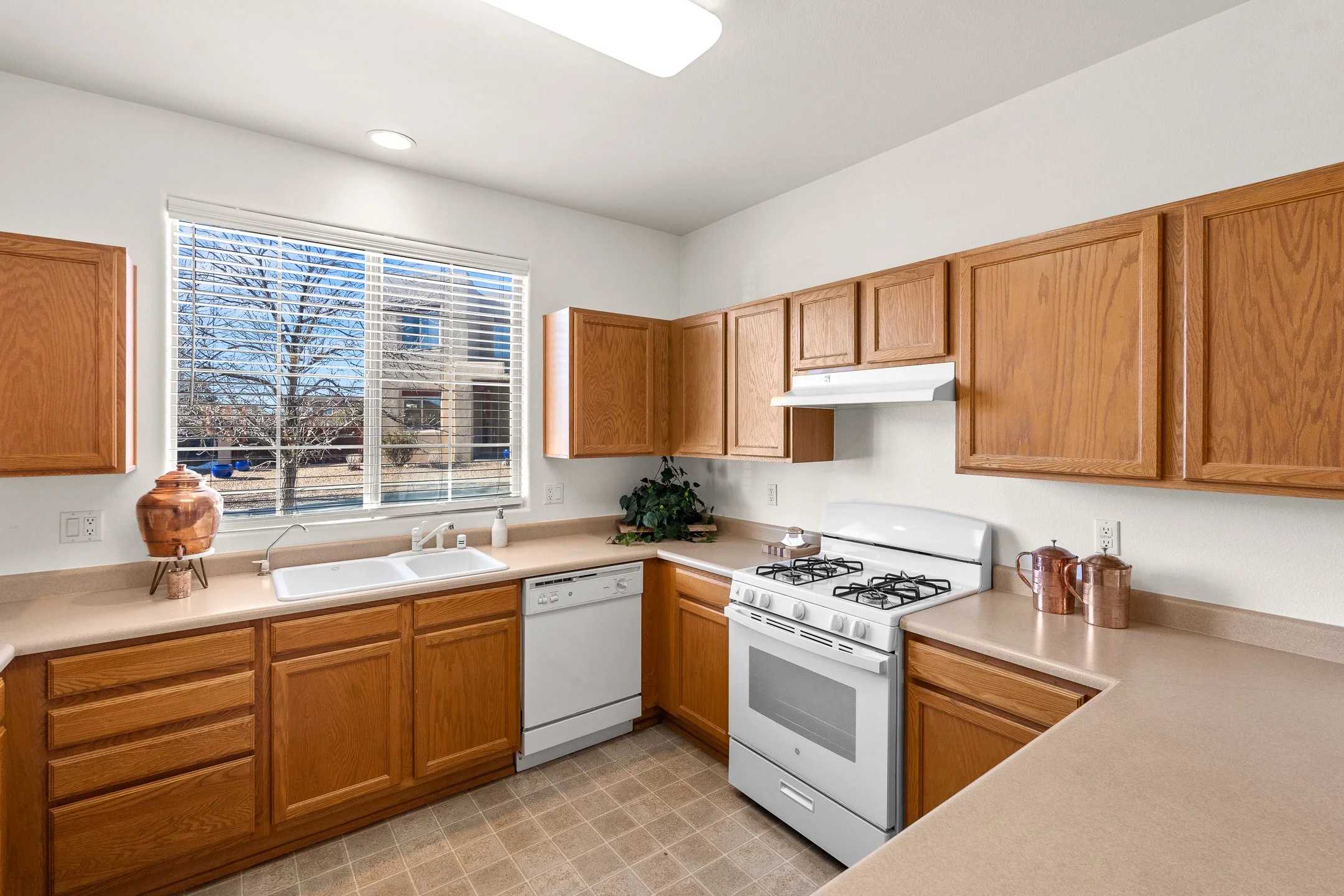 The inviting living room is anchored by a beautiful two-sided gas fireplace and sliding glass doors that enhance the home’s effortless indoor-outdoor flow. Soft window treatments and billowing drapes in both the living and dining areas add a serene, refined touch. The spacious kitchen is designed for both everyday living and entertaining, offering generous counter space, a gas range, and a seamless connection to the dedicated dining area. The dining space opens to a large, private backyard, ideal for outdoor dining, play, gardening, or relaxed gatherings with friends and neighbors.